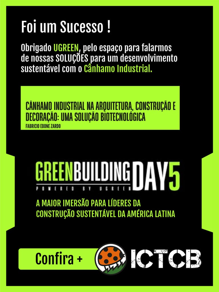 A Green Building Day 5, foi um evento realizado nos dias 11 e 12 de julho 25 no Memorial da América Latina em São Paulo. Nós tivemos a oportunidade de falar, a palestra ficou a cargo do nosso Vice-diretor, Fabricio Ebone que falou sobre uma construção Ecológica, usando produtos derivados do Cânhamo Industrial, como ConcretHemp (Os tijolos de Hemp), Mantas térmicas e acústicas, Tecidos, Bioplásticos e outros. Assista o vídeo !