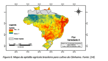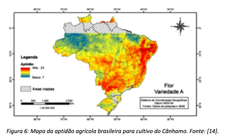 O Brasil possui um grande potencial para o desenvolvimento da cadeia produtiva do cânhamo. De acordo com Rocha, Oliveira e Souza [14], entre 80% e 95% do território brasileiro possui aptidão entre boa e ótima para o cultivo de fibras. As regiões Nordeste e Centro-Oeste apresentam as maiores aptidões.